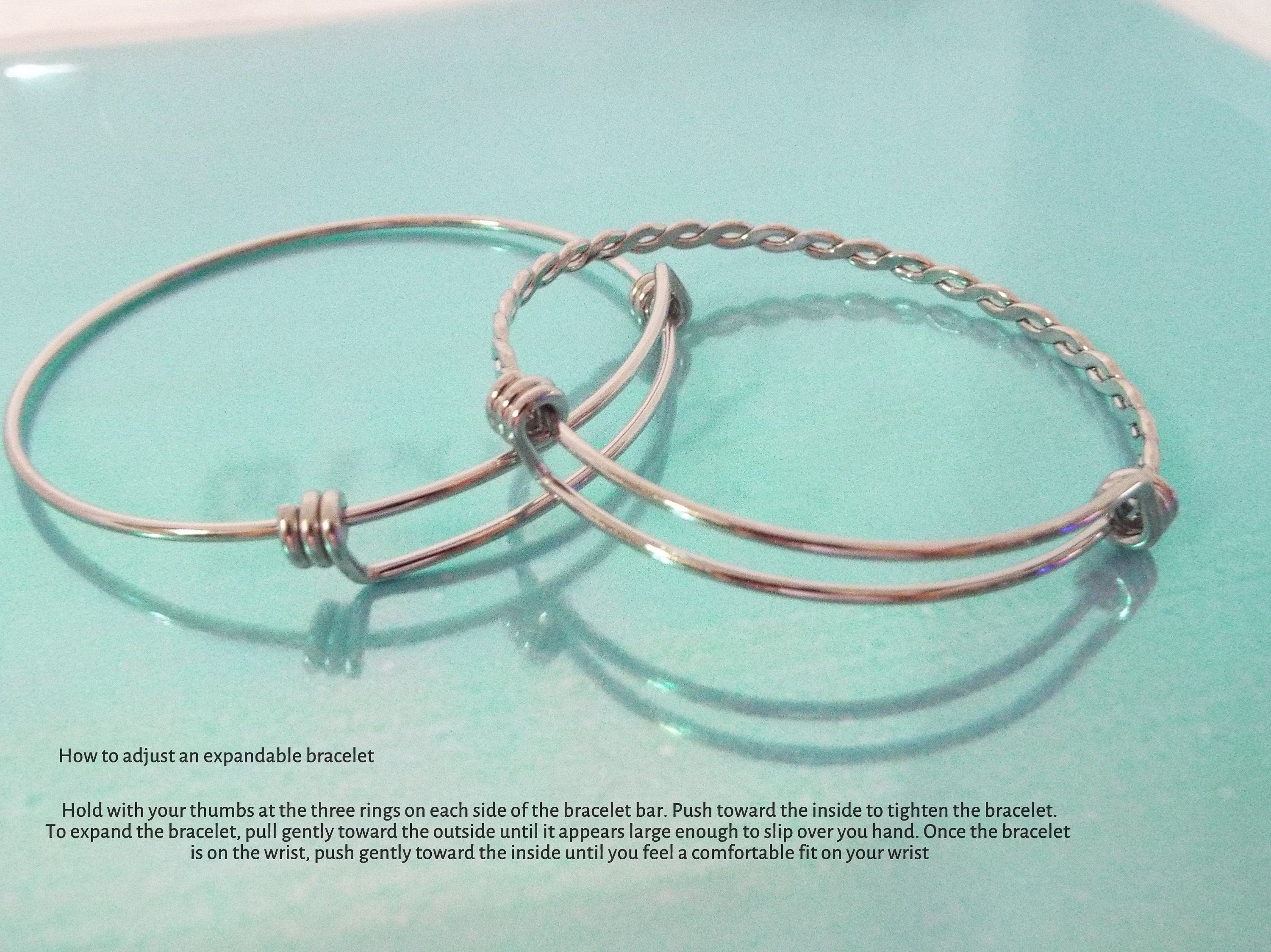 The bangle is adjustable to fit most wrist sizes and is made of stainless steel with a rose gold finish. Stainless steel bracelets are always our choice for expandable bracelets. Stainless steel ensures your bracelet will never tarnish or lose it's color - it's also easy to care for. Just a quick polish with a soft cloth, and it will look like new again. Under normal wear, it's won't bend or lose it's shape - it's the perfect metal!