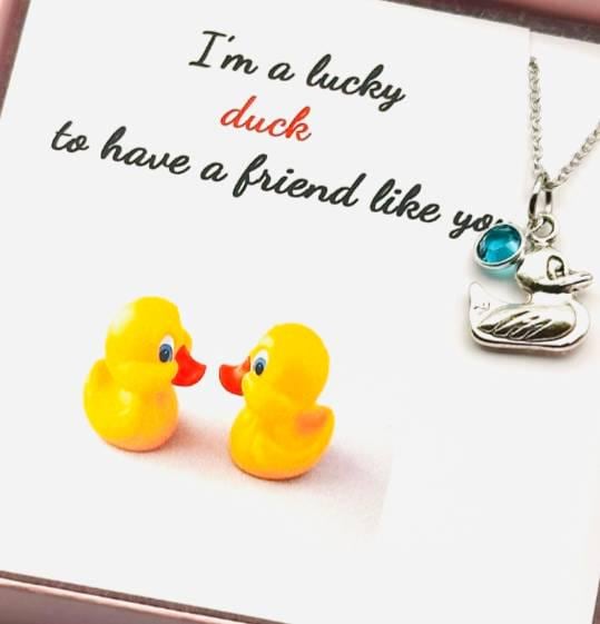 This best friend gift necklace was created with great care and pride in our craft. All of our items, including this handmade " I'm a lucky duck necklace," are special handmade creations that are original Hope is Hip designs. Our handmade jewelry is not machine-made, reasonable variations are to be expected and contribute to the uniqueness and hand finished quality of each piece. Personalized with a 6mm Swarovski birthstone. You'll be asked to choose the birthstone needed at time of purchase. Your rubber duck necklace will arrive in a gift box with a box insert that reads "I'm a lucky duck to have a friend like you". We use high quality Swarovski crystals are our birthstones.