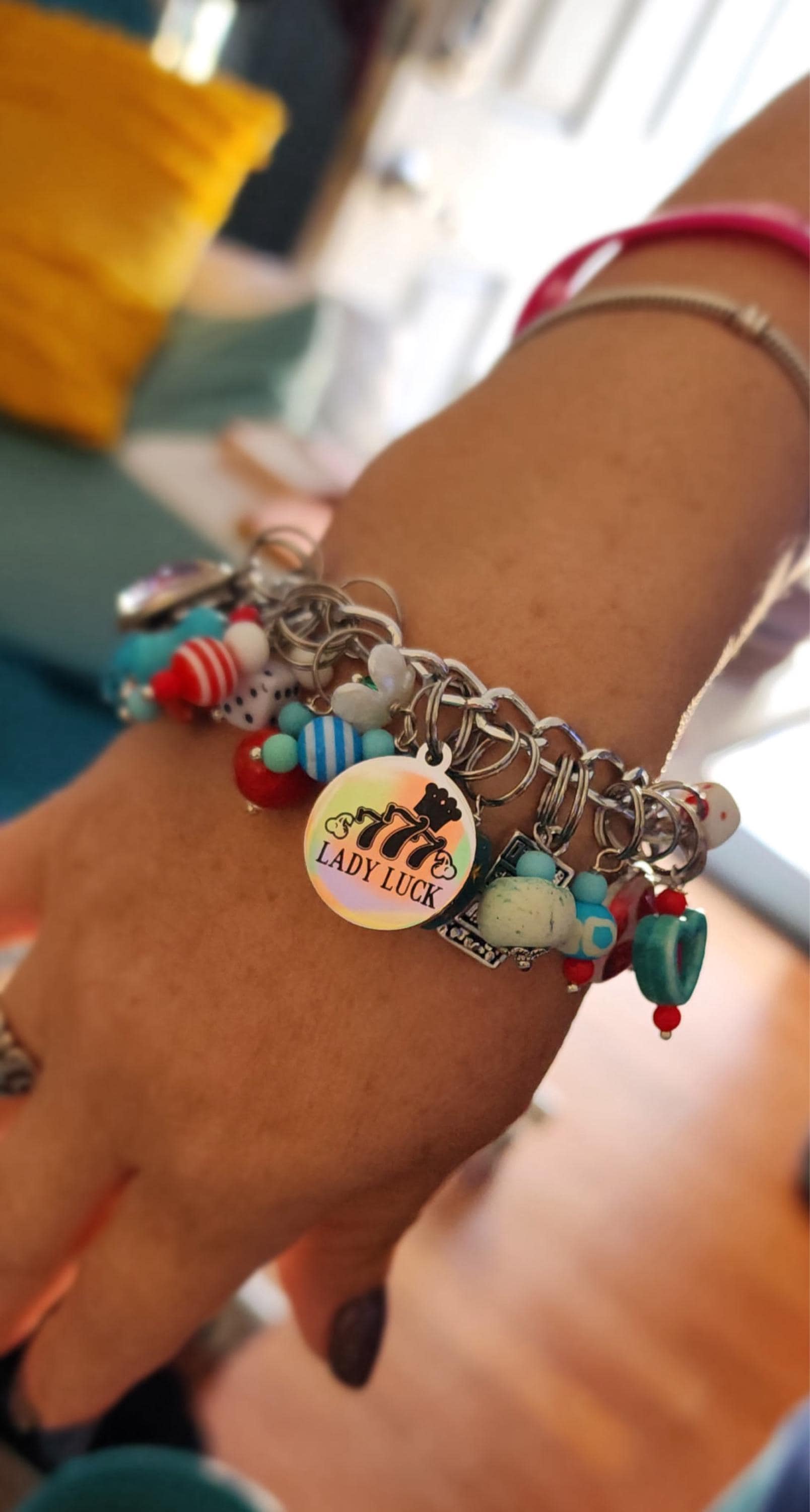 Lucky Lady Charm Bracelet - comes with all the unique charms shown and ships within two business days from Bangor, Maine. You'll be asked to select your initial choice during the checkout process. Your handmade bracelet will arrive with all of the charms shown in our photos, including all the colorful, hand wrapped glass beads. The chain link bracelet itself is made from stainless steel so it will last a long time. Wear it to the casino and hopefully it will bring you lots of luck!