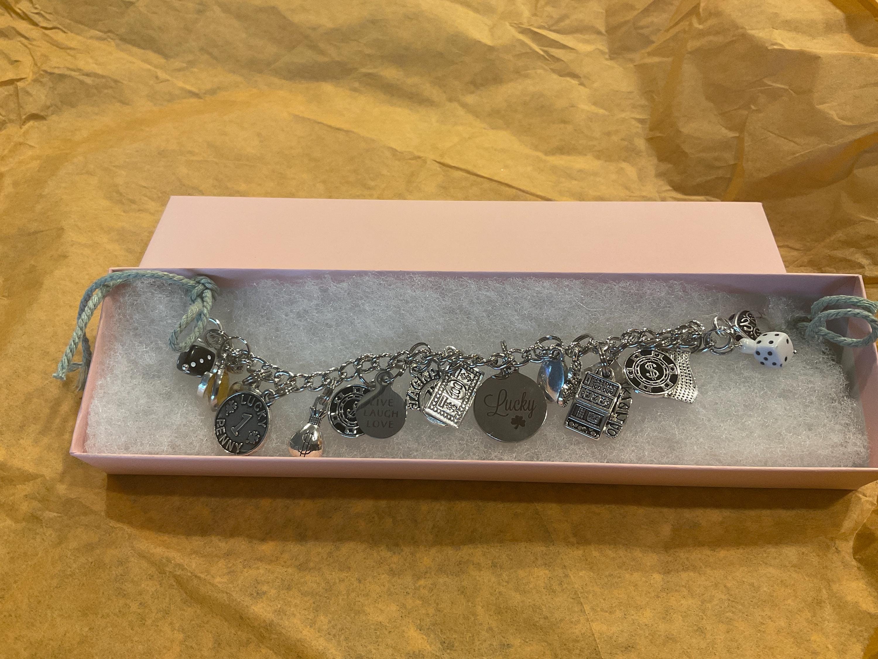 Invite good luck with this casino themed charm bracelet. Crafted from durable stainless steel chain link, this handmade gambling jewelry features an array of lucky charms designed for the ultimate gambler or Vegas enthusiast. Adorned with a 777 Lucky Lady charm, slot machine, royal flush card hand, classic lucky charm, lottery ticket, rolling dice, $100 bill, poker chips, jackpot symbol, inspirational "believe", "live laugh love" a lucky penny, plus a custom initial and sparking birthstone for that extra touch.