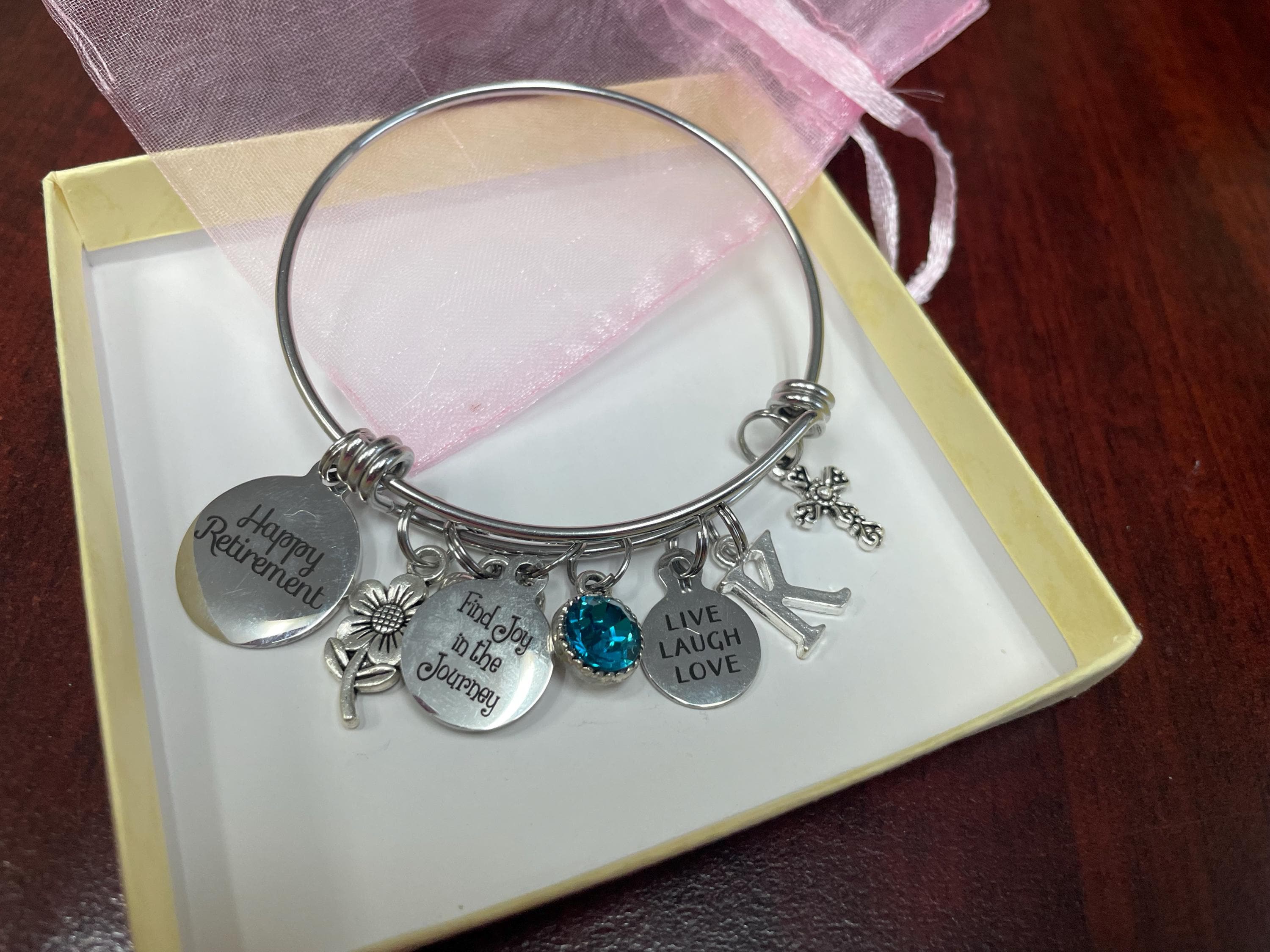 If you are looking for the perfect retirement gift, this personalized retirement charm bracelet might be just right! Handmade from stainless steel ( no discoloration and meant to last for years), this bracelet is available in three sizes. It's a timeless way to show your appreciation for years of work and dedication. Each piece comes with a variety of charm to represent the joys of retirement, and with the option to further personalize with your choice of initial and birthstone. You can make this gift truly one of a kind. Whether you are looking for an employee appreciation gift, a way to just say "thank you", or simply a congratulations present for a retiring loved one, this unique gift is sure to please whoever receives it.
