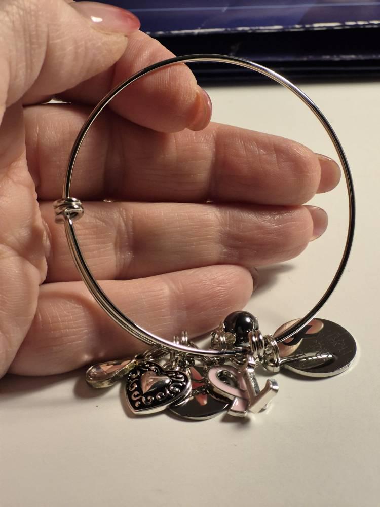 This pink ribbon survivor bracelet will mail within 2 business days from Bangor, Maine. Standard shipping typically takes 2-5 business days to arrive post shipment. Priority shipping is typically 1-3 business days post shipment. We will ship a 60mm ( standard size) expandable silver bracelet unless otherwise notified. This bracelet is available in a silver finish only and is made from jewelry grade stainless steel.